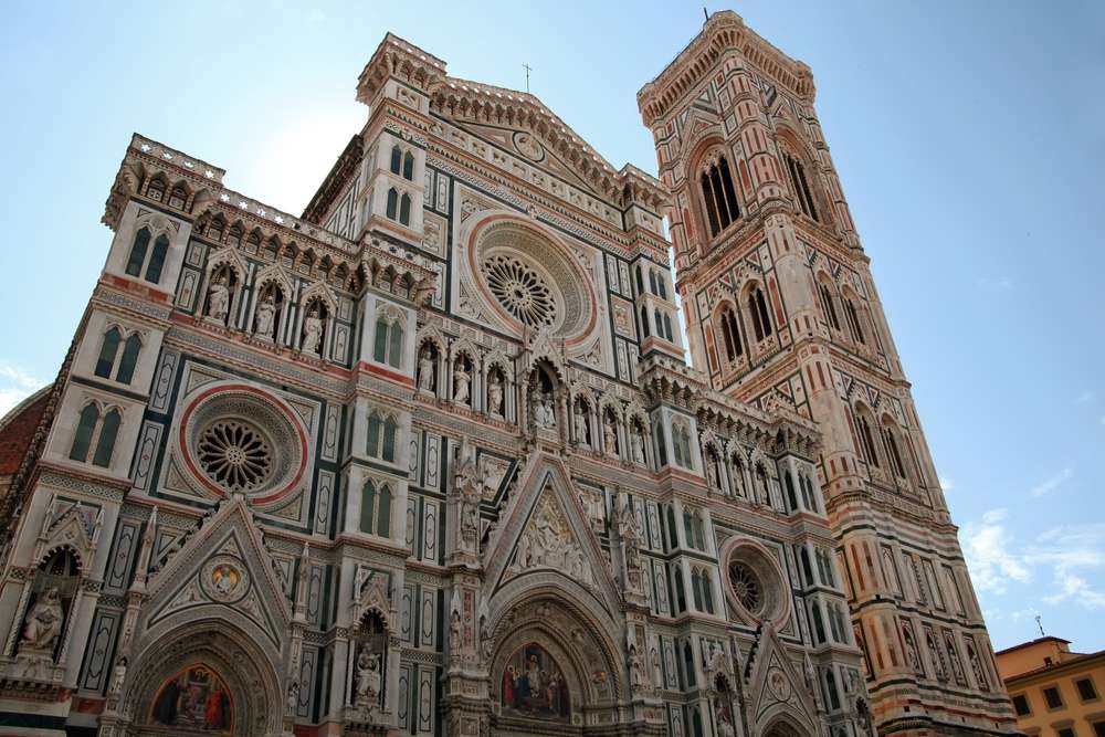 Giotto's Bell Tower is a freestanding bell tower located in the Piazza del Duomo in Florence, Italy. It is part of the larger complex of the Florence Cathedral, which includes the Duomo (Cathedral) and the Baptistry. The tower was built as a separate structure to house the bells of the cathedral and serves as a symbol of Florence's artistic and architectural heritage.
